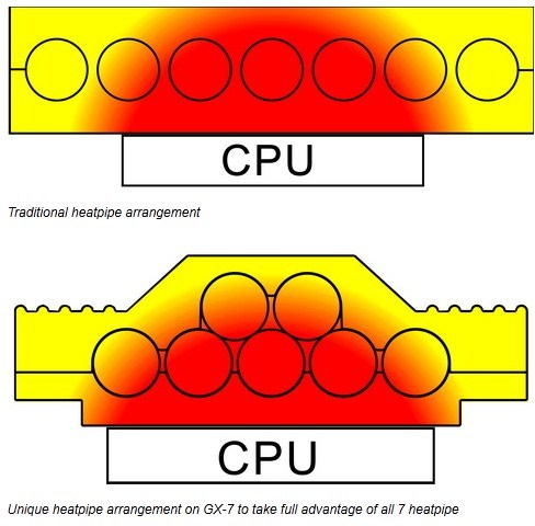 Il dissipatore è caratterizzato da accorgimenti atti a migliorare il trasferimento di calore generato dalla CPU. In particolare, il GELID GX-7 è dotato di 7 heat pipes disposte su due file e di alettature di alluminio con forma a V per ottimizzare il flusso d'aria. Inoltre, il dissipatore consente l'installazione di una seconda ventola.