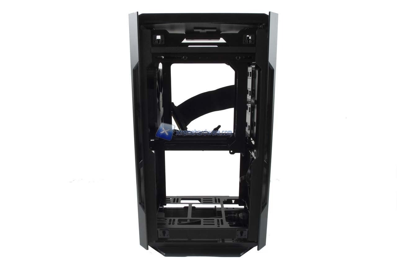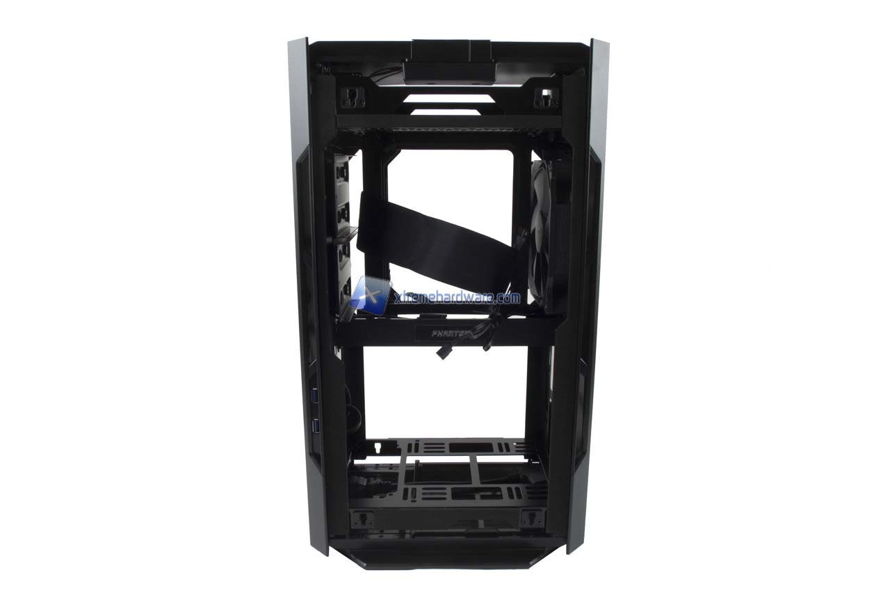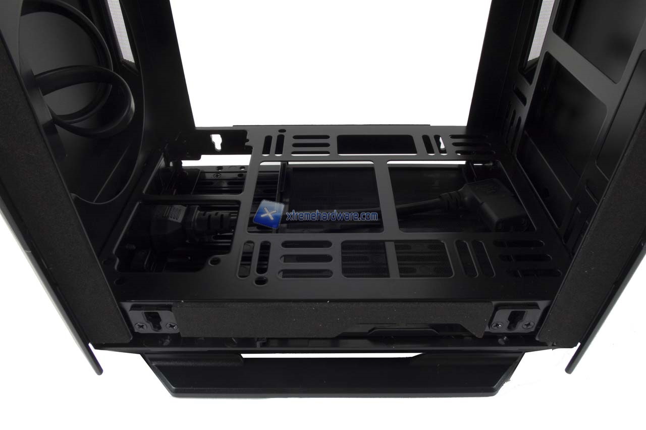 Poco sopra abbiamo il Tray della scheda madre che dovrà e potrà essere solo in formato ITX. Nel lato sinistro abbiamo due supporti per SSD. Mentre nel lato esterno i fori per fissare anche un Hard Disk da 3,5''.