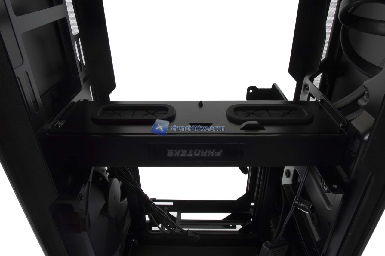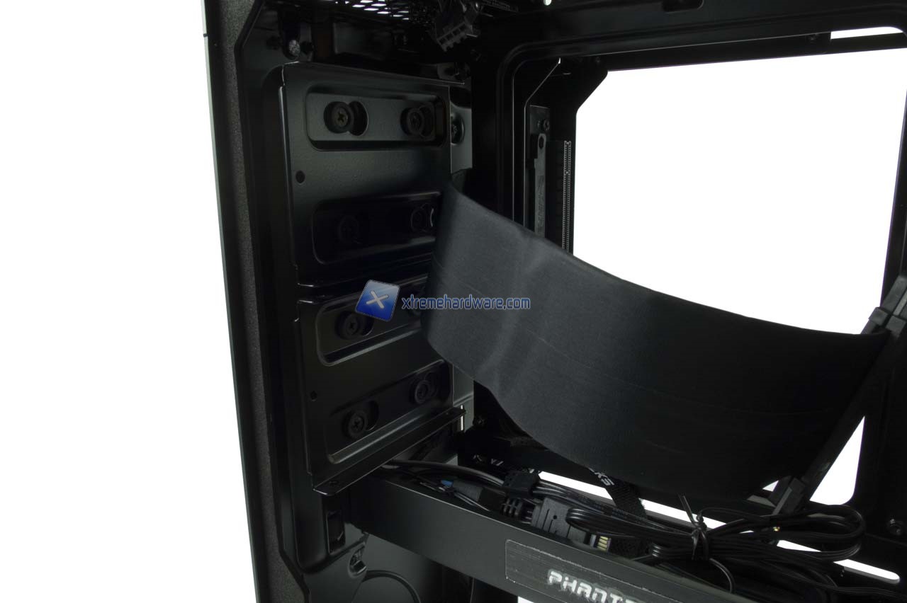 Salendo arriviamo ad un supporto centrale, sede anche di due fori con relativi passacavi in gomma e dotato di uno sportellino con logo Phanteks che in teoria dovrebbe contenere i cavi da installare sulla scheda madre.