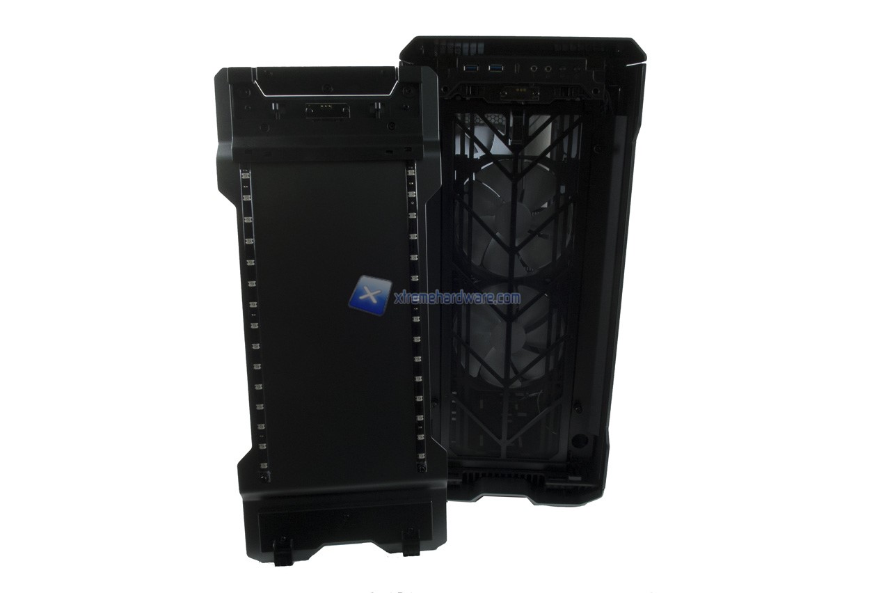 Il pannello superiore potrà essere rimosso semplicemente svitando due viti Tool-less posti nel retro del case e sfilando il pannello. In questo modo potremo accedere al supporto interno del Top ove poter installare ventole o radiatori per un eventuale impianto a liquido. Precisamente potremo installare o tre ventole da 120 mm o due da 140 mm o radiatore da 360 e 280 mm. Spazio dunque notevole per ogni ed eventuale configurazione.