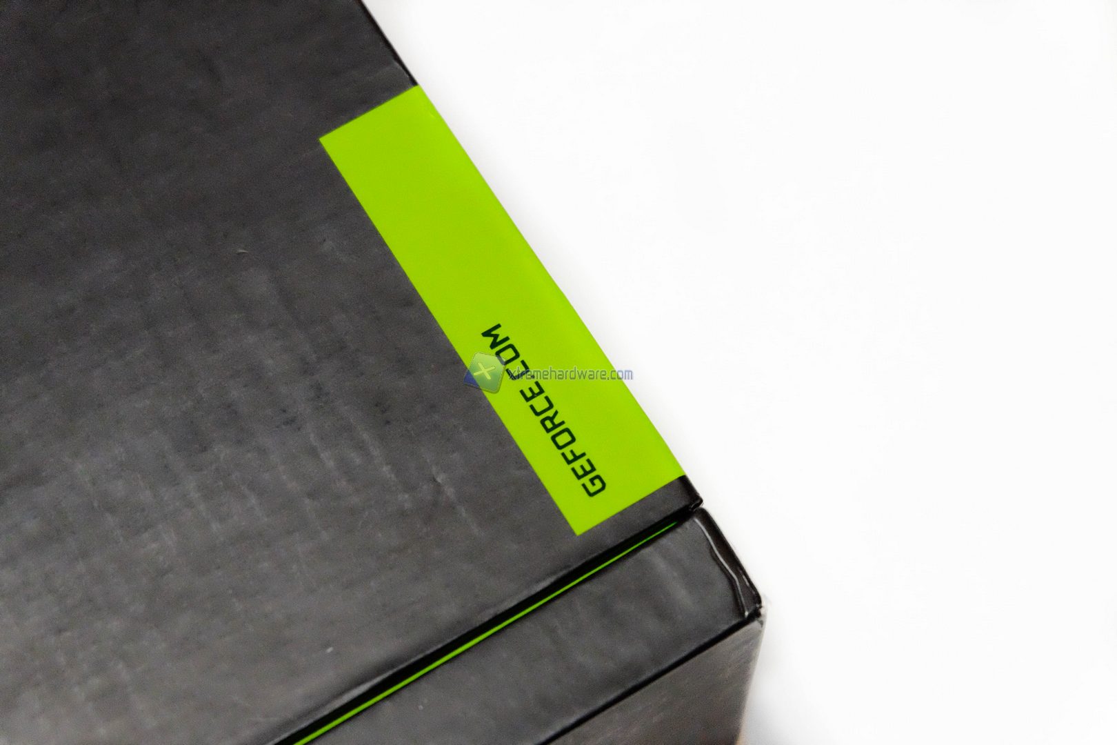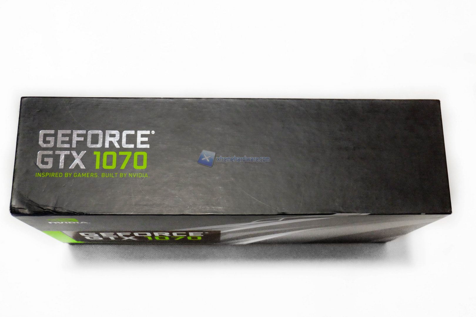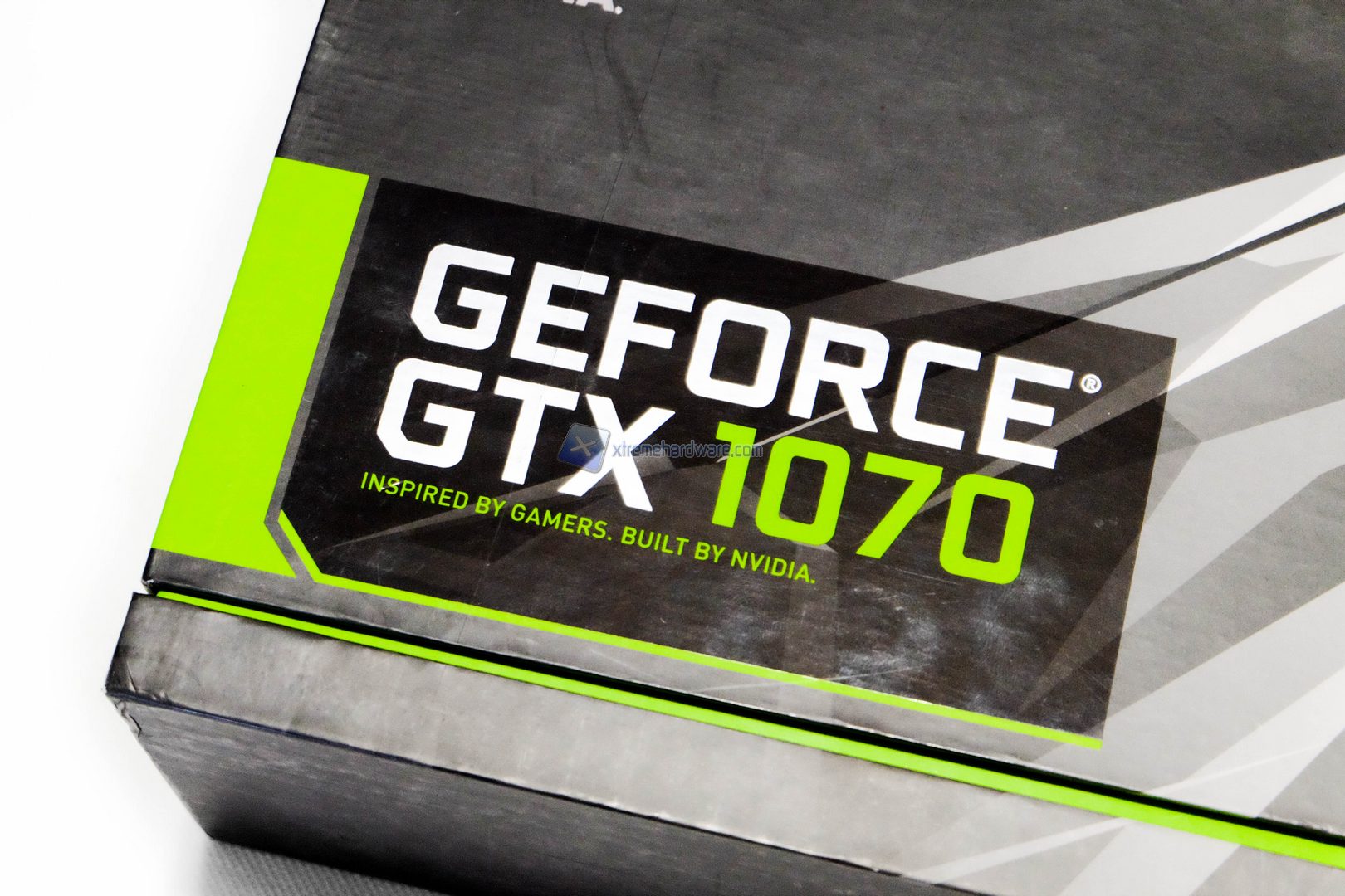 La confezione della NVIDIA GTX 1070 FE è molto semplice, ma in grado di garantire ugualmente un’ottima protezione durante il trasporto. Nella parte frontale troviamo solamente il logo dell’azienda e il nome del prodotto.