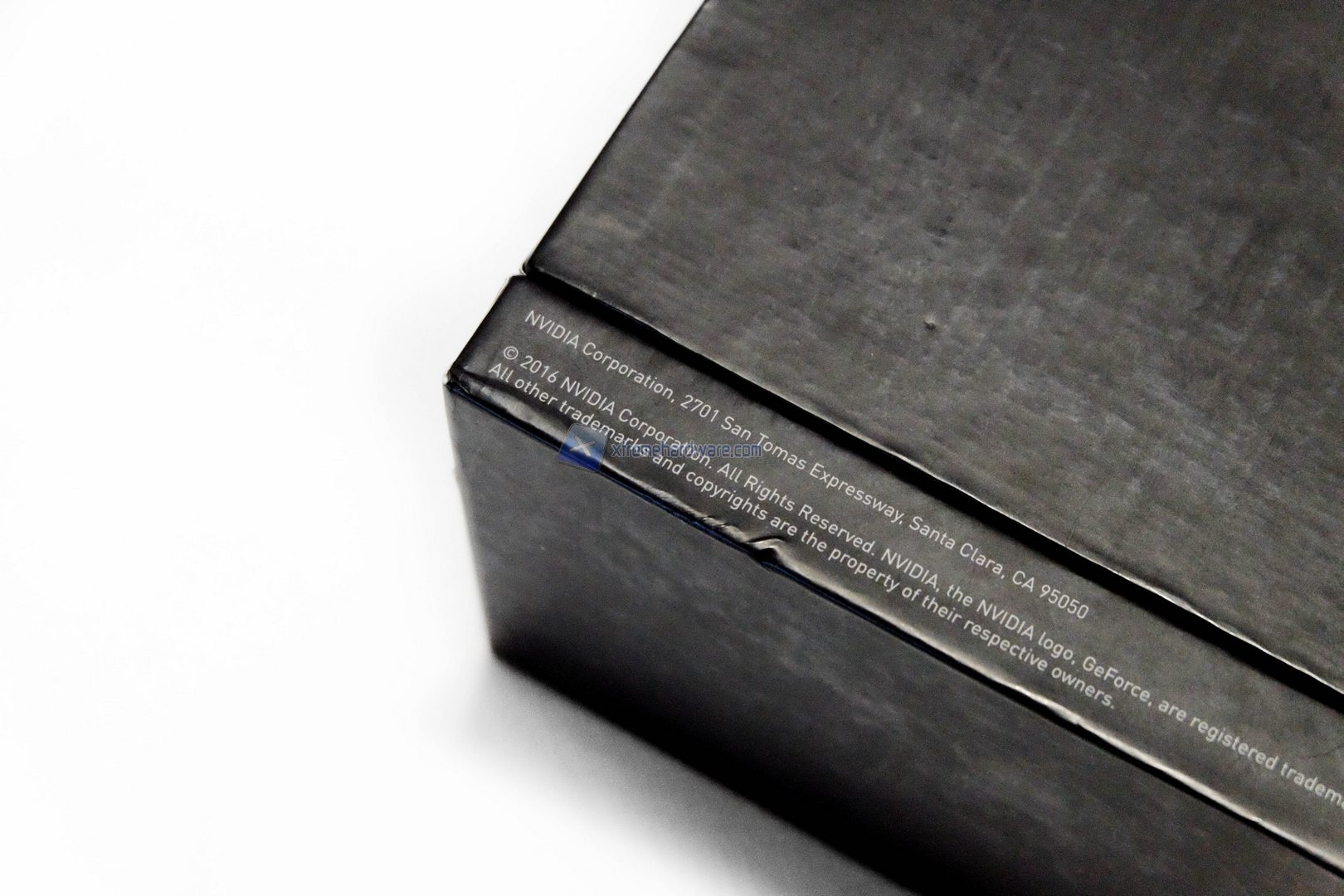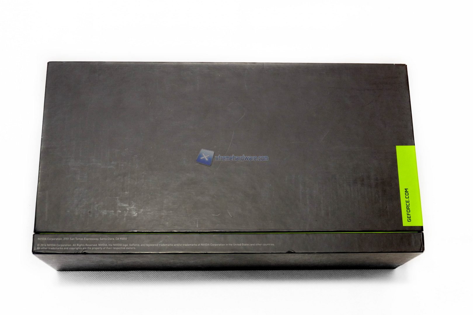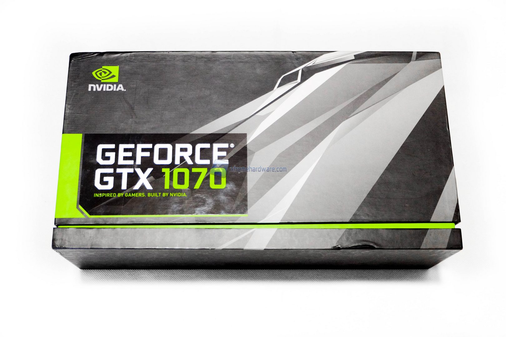 La confezione della NVIDIA GTX 1070 FE è molto semplice, ma in grado di garantire ugualmente un’ottima protezione durante il trasporto. Nella parte frontale troviamo solamente il logo dell’azienda e il nome del prodotto.